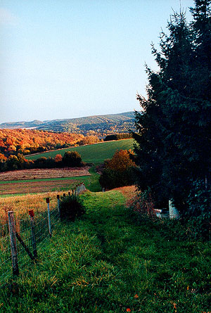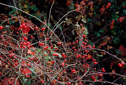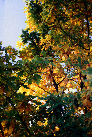 In afternoon sunlight, the colors gain an otherworldly intensity, like the trees have found God and plugged in. It's not just the trees, either; even the hedges and the blackberry brambles have gotten involved, so the view from the top of the hills outside town is a crazy quilt draped over the valley, as if someone were tucking it in before the cold of winter arrives.